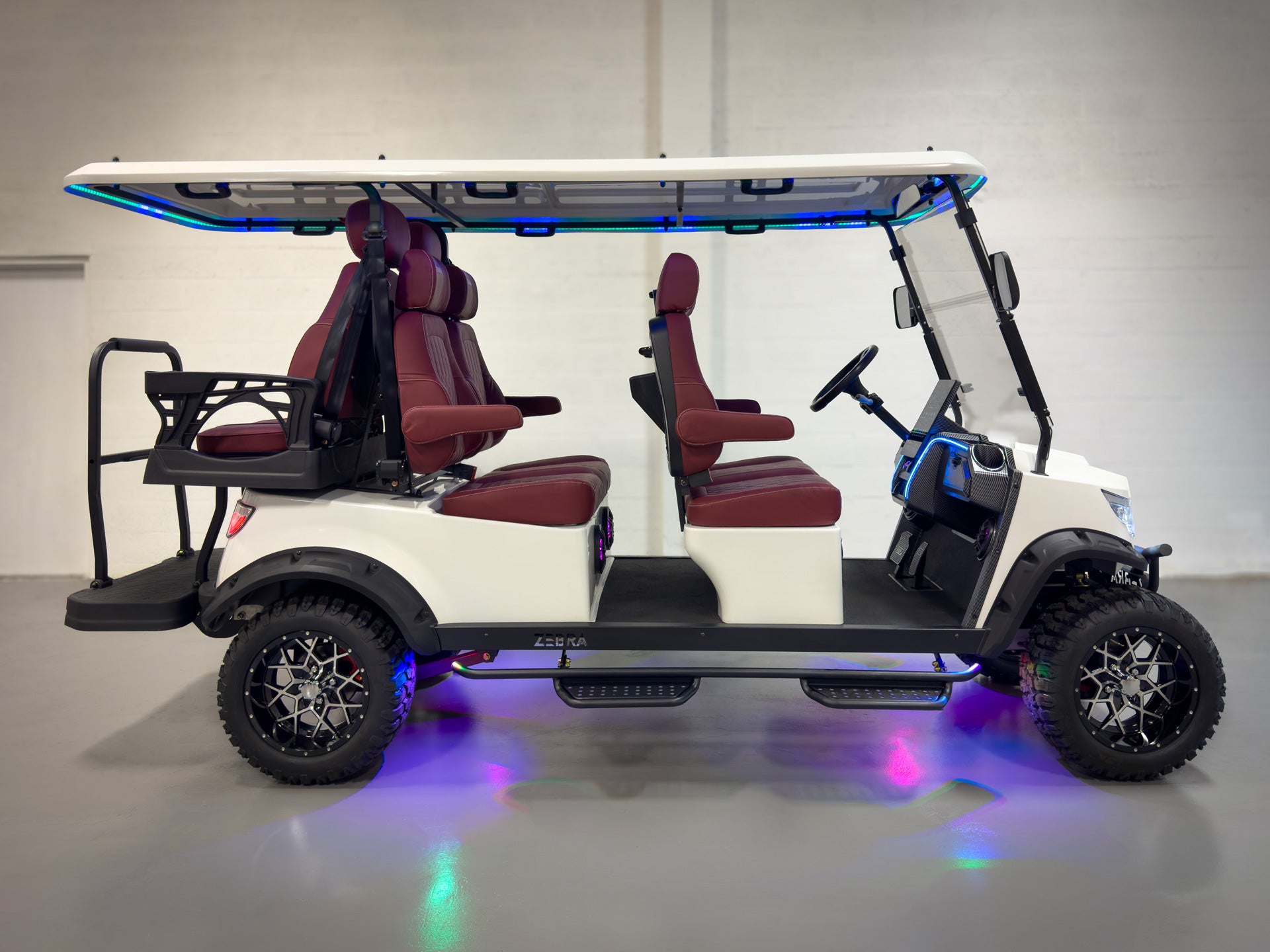 The 2nd Gen 6-Seater White Golf Cart from Zebra Golf Cart is designed for those who demand top-tier performance wrapped in sleek, modern luxury. Featuring diamond-stitched seating, Bluetooth audio, and a 13-inch display with Wireless Apple CarPlay, this cart transforms every ride into a premium experience.