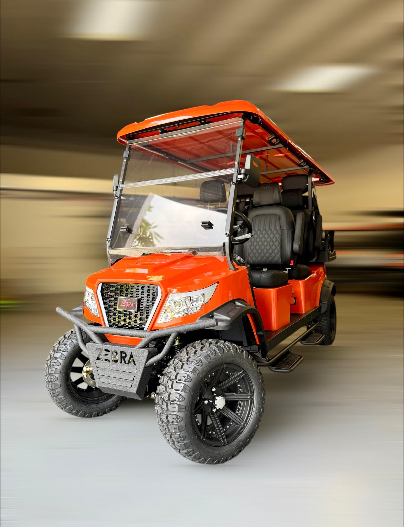The 2nd Generation 6-Seater Orange golf cart from Zebra Golf Cart brings vibrant style and luxury to every journey. Designed to accommodate up to six passengers, this cart is ideal for exploring the sun-soaked neighborhoods with comfort, efficiency, and ease.